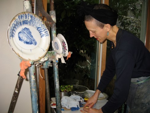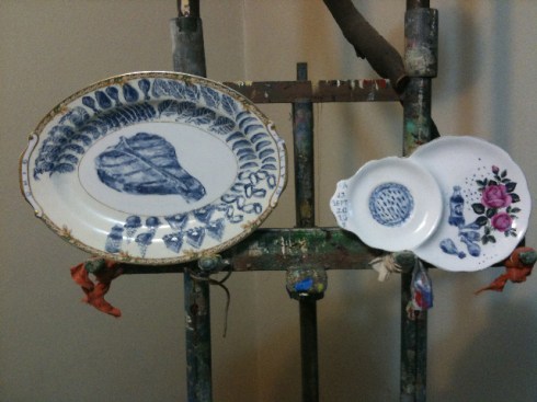 Two plates partially complete, for The Last Supper series, Julie Green’s studio, Corvalis, Oregon. Photo Credit: Julie Green