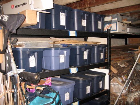 Between exhibitions, Green stores the plates in her basement. These sixteen tubs contain approximately half of the collection. Photo credit: Pete Brook
