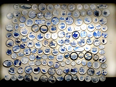 Green uses mineral paint, sometimes called porcelain paint. “I often add cobalt blue pigment to the mineral paint. Sometimes Nassau blue,” says Green. The paint slides across the reused plates and the effect is one of translucent foodstuffs. To fix the paint, Technical advisor Toni Acock kiln-fires each plate at 1,400 degrees Fahrenheit.