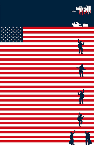 Images sources: Rolling Stones lips; Prison bars, from Teen in Jail; American flag of pills, by Talia Marisa; Heels, Fashion Munster; Spectacles, Linda Lovelock wears American flag sunglasses during the 2010 Tax Day Tea Party April 15, 2010 in Pleasanton, California. Tea Parties were held across the United States to denounce tax day. More than a thousand people attended the Tax Day Tea Party at the Alameda County Fairgrounds. (April 14, 2010 – Photo by Justin Sullivan/Getty Images North America); Bush family; Corporation flag; ISBN flag, via Adbusters; Coffin at night, Sudanese men look at the flag-draped coffin of U.S. diplomat John Granville, 33, who worked for the USAID, as it is received by U.S. officials in Khartoum, Jan. 3, 2008. (AP); US flag bomb graphic, via Daily Bleed; Imperialism flag, Christian cross, on eBay; Star-spangled burqa; Rocky Balboa shorts; Olympic winners, via Astropix (Teammates in the USA women’s 4 x 100 meter relay swim team stop in front of a giant American flag to wave to fans after winning the gold medal and setting a world record in the finals of the event during the 1984 Olympics in Los Angeles. From left are Jenna Johnson, Dara Torres, Carrie Steinseifer, and Nancy Hogshead.); Child’s drawing, via Fire Andrea Mitchell; School class photo, via Valley Community Newspaper (The Girl Scouts who meet for troop activities at Martin Luther King Jr. Elementary School had an American flag flown over the nation’s capitol on Dec. 6 to honor the school. Photo Credit: Unknown); Immigration wall graphic, by Luis Boix; “Does my fag offend you?” bumper sticker; Immigrant labour graphic, by La Mustia; Supermarket beers, via Corks and Kegs; Cupcakes, The Cupcake blog; Spliff, from Rolling Stone via The War on Drugs is a War on Me.