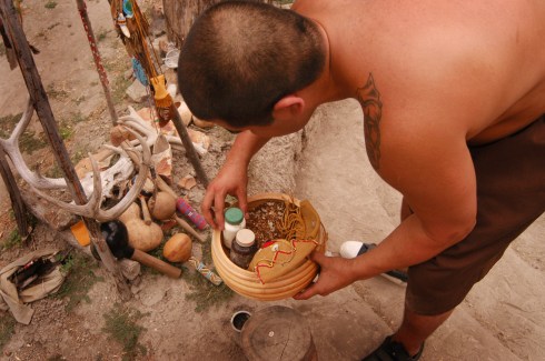 Native American Spiritual Leader Jimi Castillo welcomes a ward who prays before entering the Sweat Lodge.