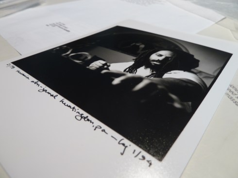 Print of Mumia Abu-Jamal portrait by Lou Jones. During the PPOTR interview at his Boston studio, Jones said when he made the portrait it was the first time in 5 years that Mumia had been photographed without shackles on his wrists.