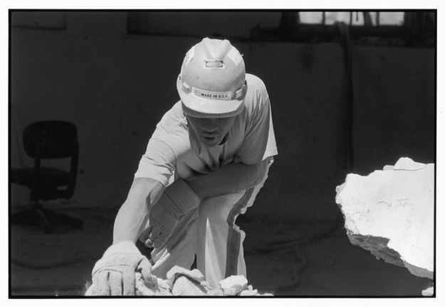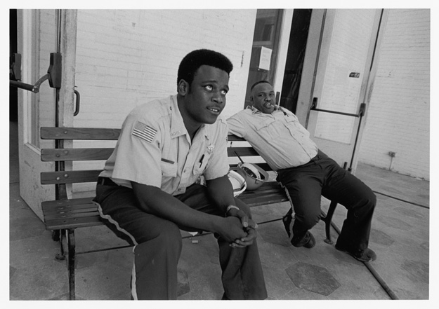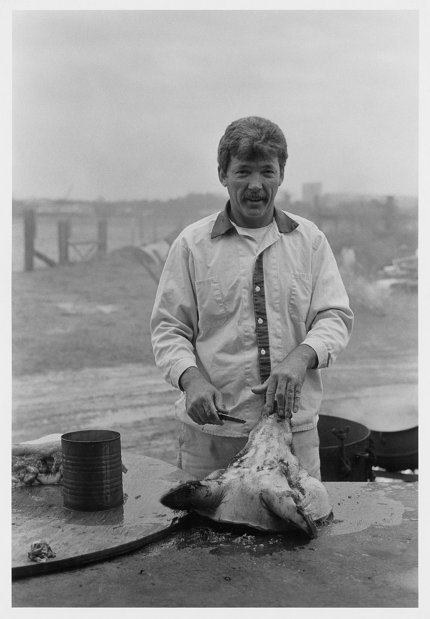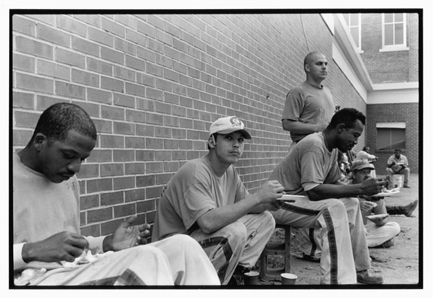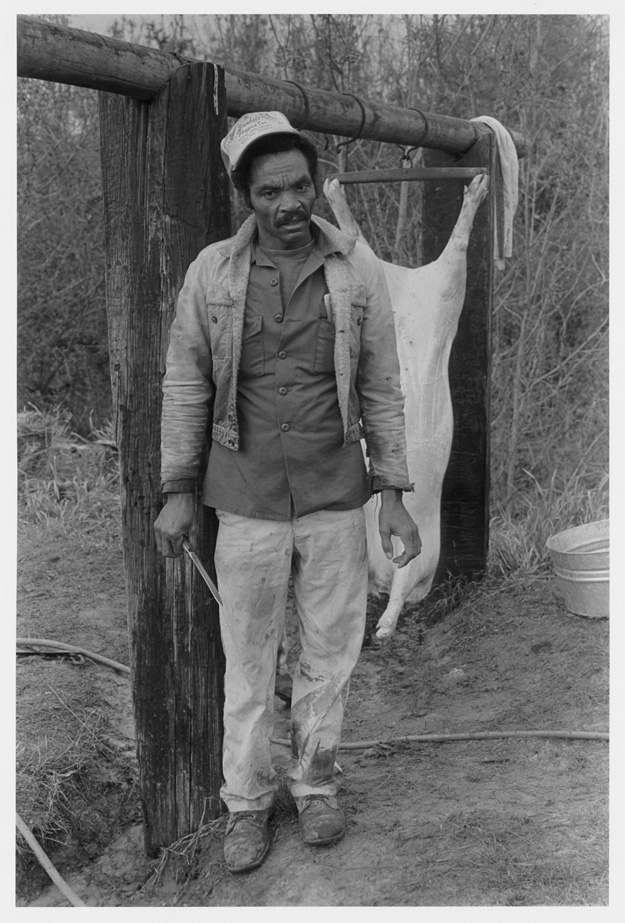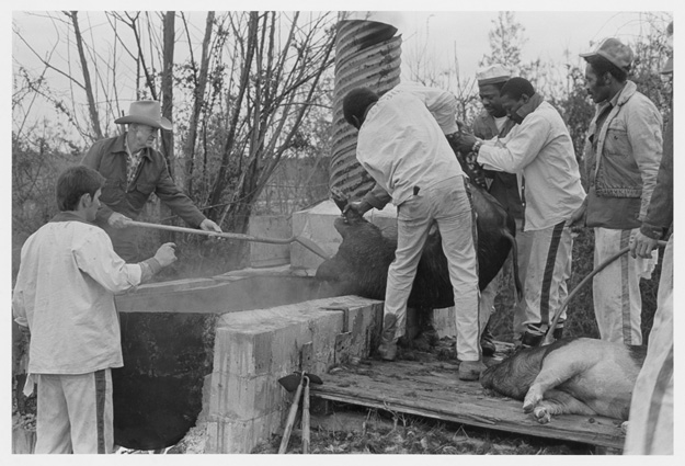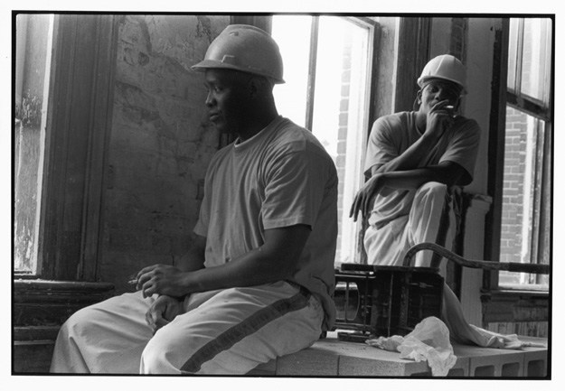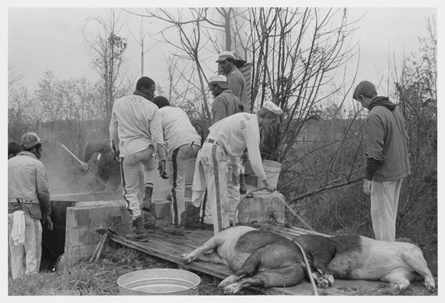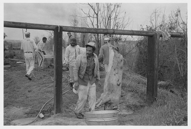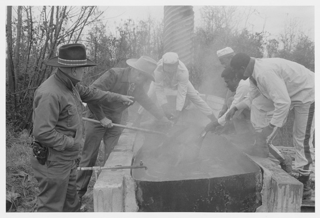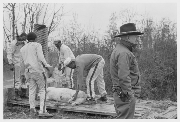 What I so fascinating about Kwilecki’s photographs is that they focus on the work details to which prisoners were assigned, ranging from 1966 to 1998. I don’t want to get into a debate here about the degree to which the work Kwilecki photographed was rehabilitative – it would be pure speculation. Instead, I’d ask you to muse on the changing nature of the work – cane syrup production; irrigation ditch digging; courthouse janitorial work; brush-clearing; hog butchering; and construction and renovation work, again in the courthouse.