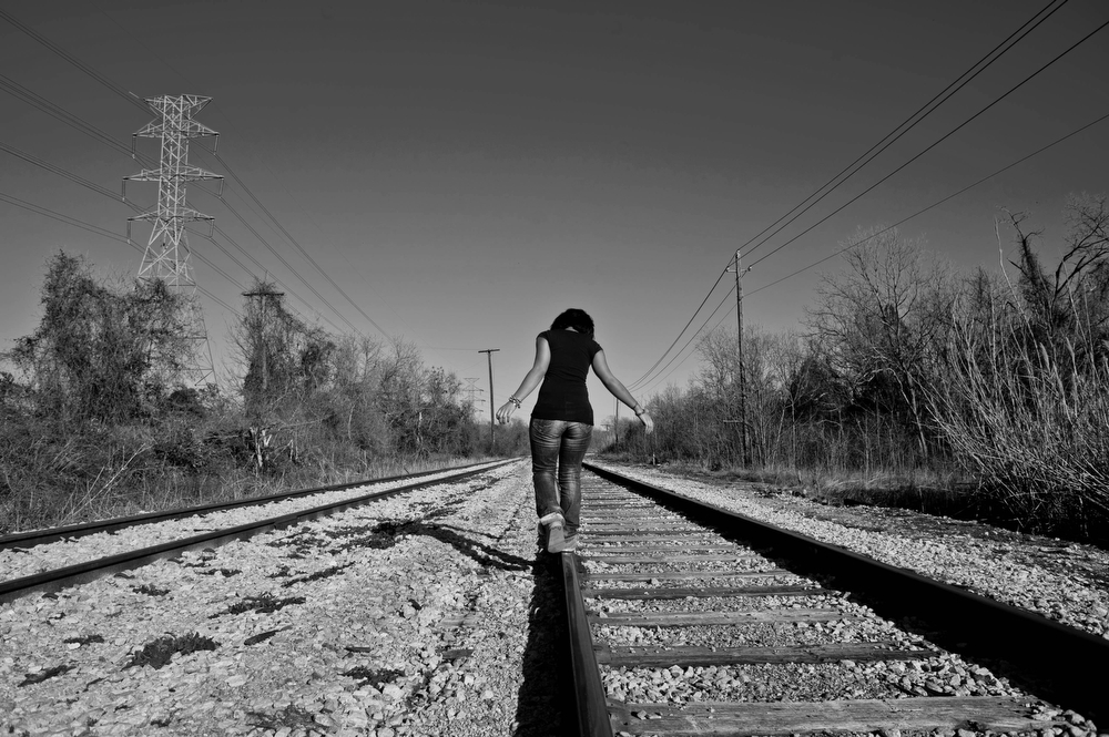 Chelsea Shorts walks alone railroad tracks in Austin, Texas. Shorts father was incarcerated for most of her life.