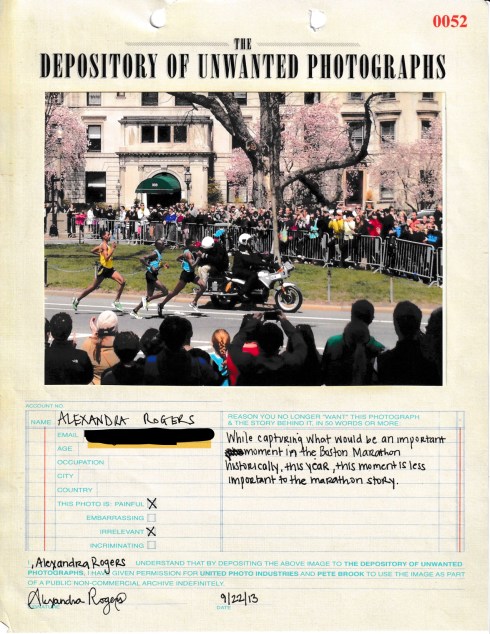 From serious concerns to exorcism of the frivolous, TDOUP distills our different experiences and priorities—a portrait of a man who’s death spurred the only time a daughter saw her father cry; an engagement ring from a union that never materialized; photos of family abusers follow those of rancid chocolate; bad pics of the moon or the street; blurry photos of friends; the last photo before alcohol-eradicated memory took hold; Polaroids with emotional burden too heavy to carry; embarrassing clichés, cringeworthy selfies; photos of an IVF clinic and of the pogo-stick world record; accidental but beautiful prints made by misfiring processors; haunting images of soon-to-die parents; and a photo from the crowd of the 2013 Boston Marathon hours before the terror attack at the finish line. The interrelation of the images is as unpredictable as the motives for their original submission.
