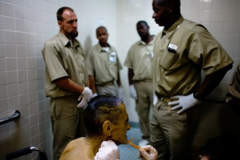 Video still from an incident in Maine Correctional Center, June 10th, 2012. Capt. Shawn Welch sprays pepper spray into the face of Paul Schlosser who is bound in a restraint chair after the prisoner, who has an infectious disease, spat at an officer. The video came to light after reporting by The Portland Herald in 2013. Prison Photography‘s analysis at the time: ‘The Spit Mask As Prison Torture Apparatus’