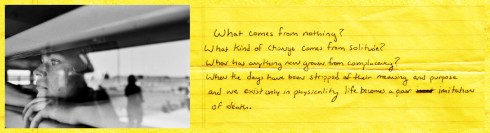 Juvies is collaborative because often his images are accompanied by the handwritten texts of incarcerated young people. Frequently the writings focus on emotional ties, problems with self esteem, the powerlessness against a system. It makes sense then that many of Oshagan’s photographs are visually-fractured, detached.