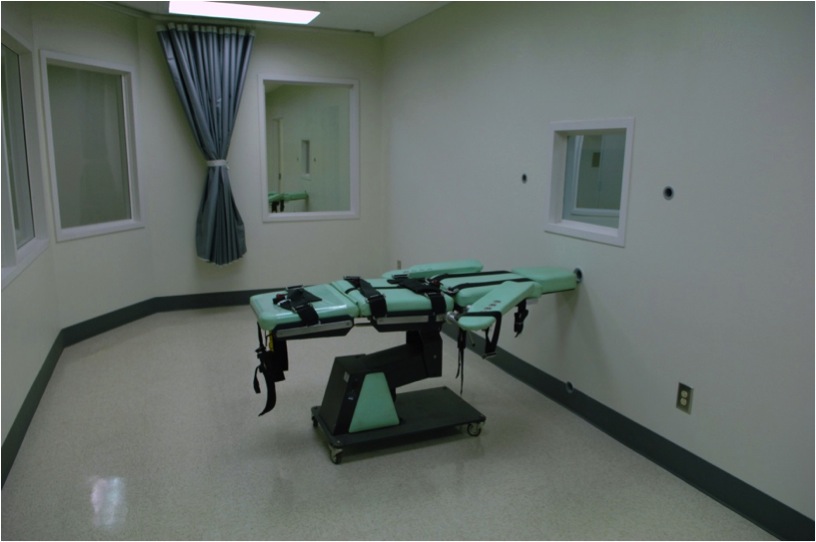 Injection Room. Window and hose ports to Infusion Control Room at right, mirrored window for victim family viewing in center, public witness / media gallery on extreme left. Courtesy of the California Department of Rehabilitation and Corrections.