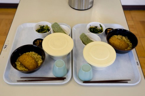 Elderly prisoners (in white) preparing lunches for their fellow inmates, presided over by a prison guard, in Onomichi prison, Japan. Monday, May 19th, 2008.