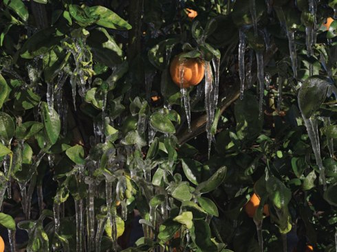 All images: Lucas Foglia. (Top to bottom): 1. Kate in an EEG Study of Cognition in the Wild, Strayer Lab, University of Utah. 2. Esme Swimming, Parkroyal on Pickering, Singapore. 3. Lava Boat Tour, Hawai‘i shows brand new land created by lava pouring into the ocean. 4. Air Sampling, Mauna Loa Observatory, National Oceanic and Atmospheric Administration, Hawai‘i. 5. New crop varieties are grown and tested in the Geneva Greenhouses at the New York State Agricultural Experiment Station. The USDA’s national and regional seed banks store hundreds of thousands of plant varieties, and crop scientists race to create a climate-change-resilient agriculture. As droughts, extreme rainstorms, and other erratic weather patterns intensify, farmers need crops that can cope with such stresses. 6. Ice to Protect Orange Trees from the Cold, California. 7. Evan sleeps at Camp Eighteen, overlooking the Vaughan Lewis Icefall. One of the greatest non-polar concentrations of glaciers in the world, the Juneau Icefield spans 90 miles of southeast Alaska. 8. Icebergs float away from the Gilkey Glacier in Alaska. 9. Kenzie inside a Melting Glacier, Juneau Icefield Research Program, Alaska. 10. Honey bees trail water across a rooftop after rain in Portland, Oregon.