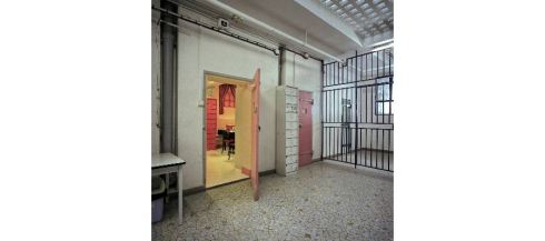 Jacqueline Salmon‘s photograph are straight environmental studies. In some works she uses the silhouettes of cage, fence and shadow. Often Salmon’s images will offer the promise of a window or vista only to present a barrier or razor wire immediately behind the promise. These are images of frustration. When Salmon documents open doors, they are within larger areas of containment, not strategically imperative and are not policed by the disciplining authority. Through some of these are the work and leisure activities offered at Le Santa Prison, Paris; gymnasium, family rooms, kitchen, chapel and laundry.