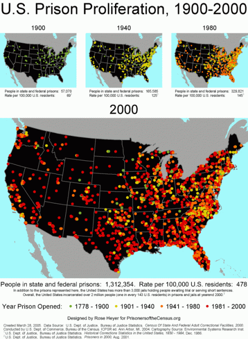 Heyer produced the map U.S. Prison Proliferation, 1900-2000 and she co-authored Too big to ignore: How counting people in prisons distorted Census 2000, Importing Constituents: Prisoners and Political Clout in Massachusetts Importing Constituents: Prisoners and Political Clout in Texas, Importing Constituents: Prisoners and Political Clout in Ohio, and Thirty-Two Years After Attica: Many More Blacks in Prison but not as Guards. Rose is now GIS and CAD consultant in California.