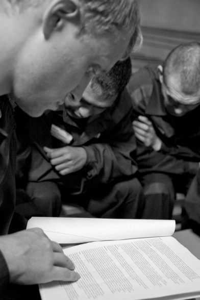 The motivations for the actors come from the challenges of the characters in the stories – Chekhov’s “The Burbot”, Babel’s “My First Goose” and “Butterfly” written by Albertik Sadrutdinov, one of the prisoners. Characters were discussed and interpreted in the first week of rehearsal. Tanja Arno, an actress from Moscow was the only member of the cast not from the prison.