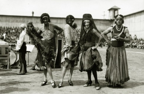 Stage entertainment with four male dancers in female dress, San Quentin Little Olympics Field Meet, 1930. Courtesy Anne T. Kent California Room Collection, Marin County Free Library.