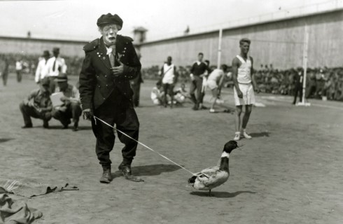 Clown performance featuring a duck, San Quentin Little Olympics Field Meet, 1930. Courtesy Anne T. Kent California Room Collection, Marin County Free Library.