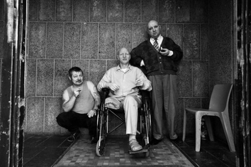 Three patients smoking at the entrance of their ‘block’ in Paifve, Liège on Feb. 16, 2011. © Sébastien van Malleghem.