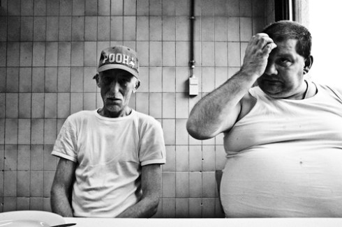 Two patients are eating their meal in the kitchen of the prison of Paifve, Liège, Belgium on March 3, 2011. © Sébastien van Malleghem